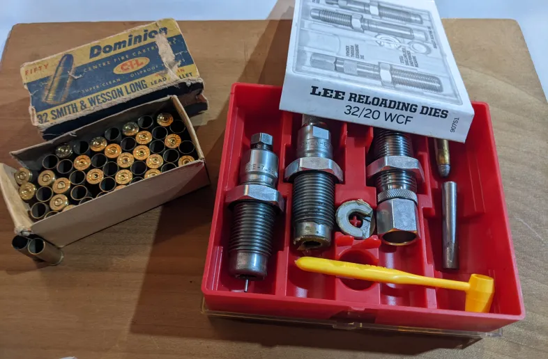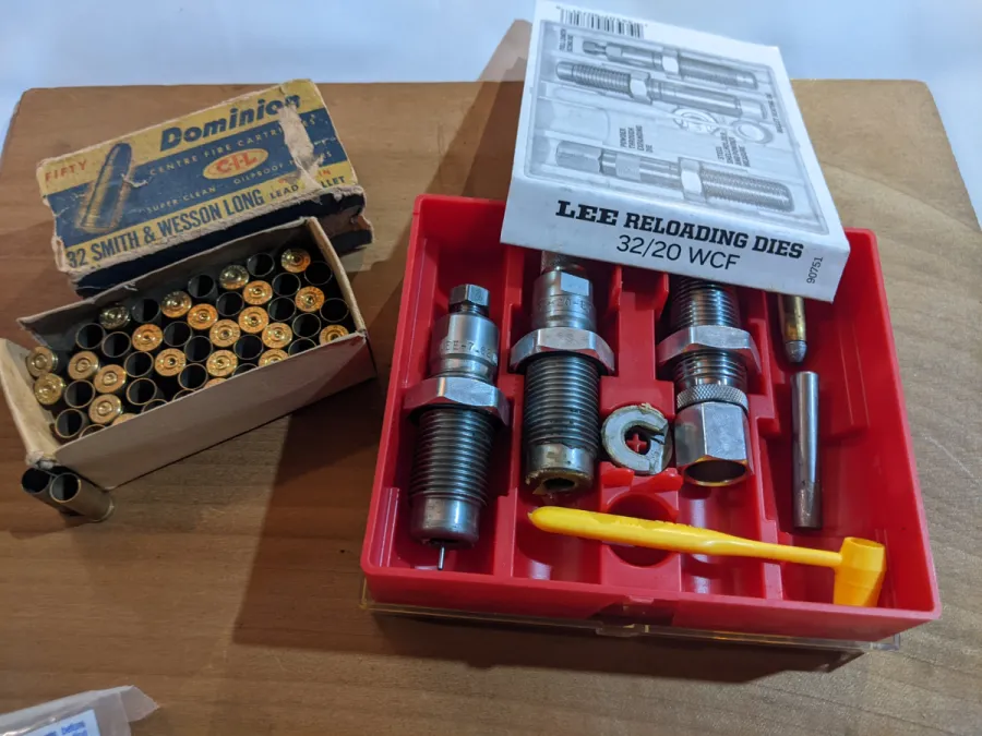My nearly new .32 S & W long reloading kit. Lee dies, 48 used casings (CIL) and about 120 new 32-20 Winchester casings (have to be trimmed if used in 7,5mm Nagant or .32 S & W)