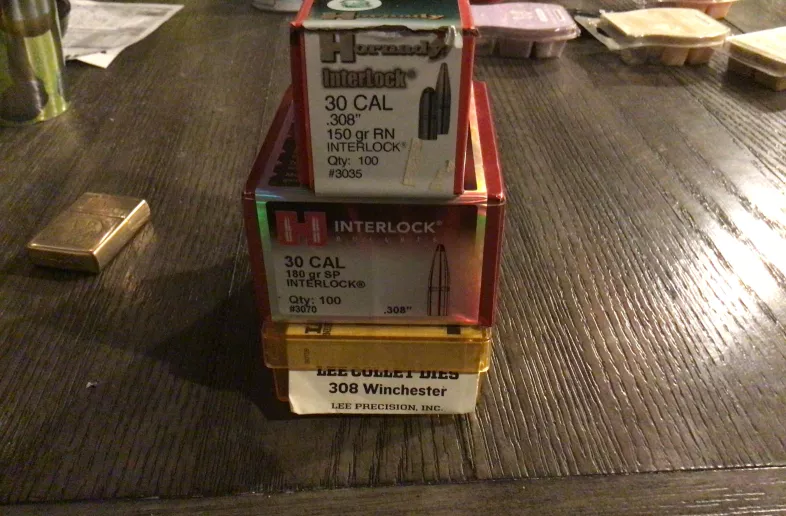 Lee two piece 308 die set comes with one box of 150 gr interlock and one box of 180 gr interlock bullets also have brass I’ll let go for extra shippings on your dime