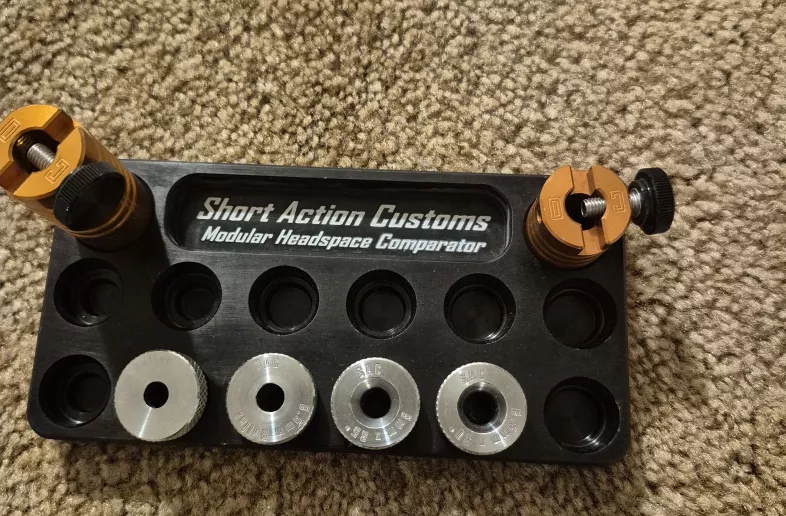 Short action customs modular headspace comparator. Never used. Comes with 6mm, 6mm x 35°, 6.5 mm, and 6.5 x 30* inserts, stand and two bodies. $250
