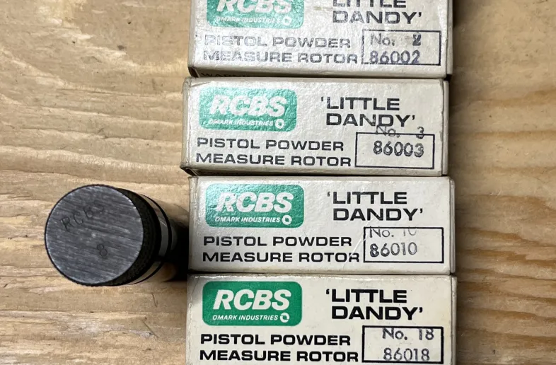 RCBS little dandy pistol measure comes with 7 charge rotors (2 are the same). I have never used, it was included in a reloading kit I purchased.