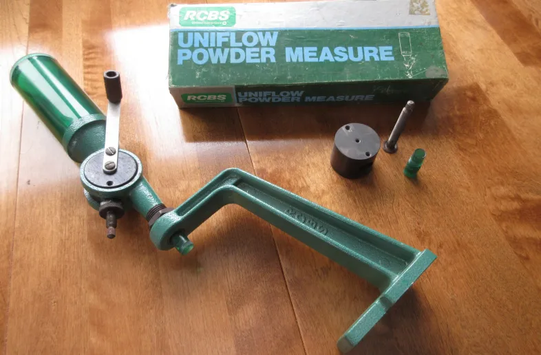 RCBS uniflow powder measure with two different sized drums and discharges for large and small measures.