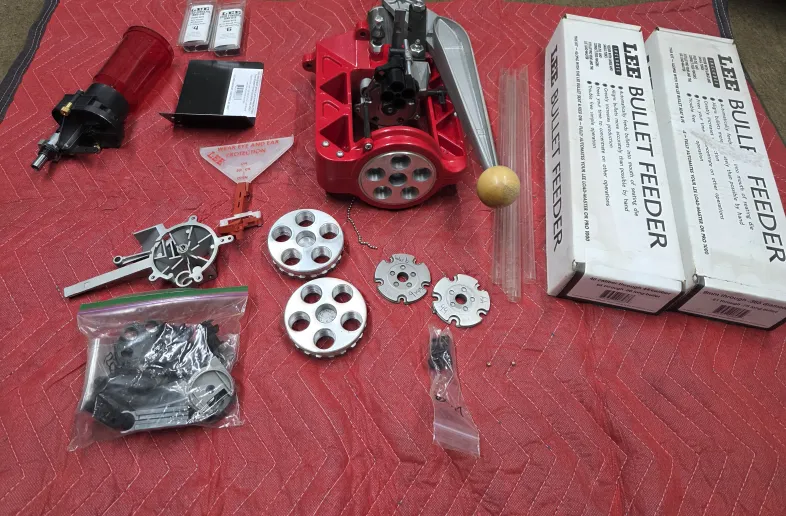 Comes with 3 turrets, 3 she'll holders .44 9mm and 5.56, a whole parts kit. 2 sets of bullet feeders for complete automation, volume powder measure with dies and all the odds and ends to get it up and running. Will ship. This will do rifle and pistol shells.