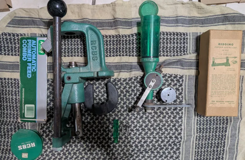 Everything in the picture is included. RCBS RC2 Press with primer attached. Comes with powder pourer and vintage Redding scale. Also comes with primer pocket cleaner. Good quality equipment that will outlive any reloader, great for someone looking to start in the hobby.
