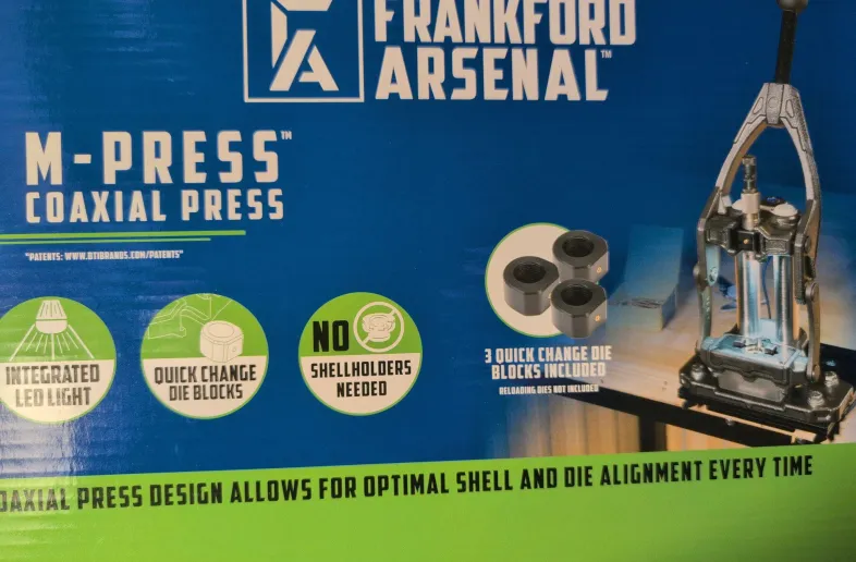 Selling a Frankford Arsenal M-Press Coaxial Single-Stage Reloading Press (SKU 1097879). Features a floating/universal shell plate system, quick-change die blocks, integrated LED work light, spent-primer catcher, and ambidextrous handle. Uses standard 7/8"-14 dies and is designed for excellent alignment (low runout). Includes 3 removable die blocks.