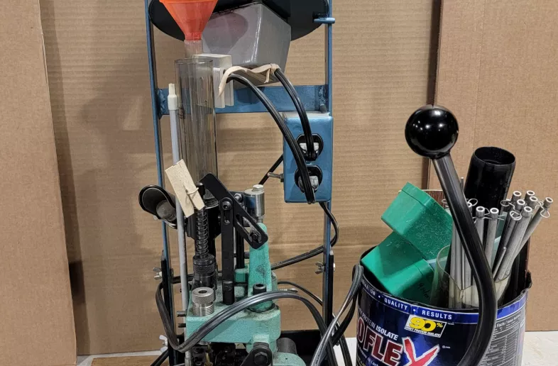A progressive reloading press, designed for efficiently reloading multiple rounds of ammunition. Currently set up for 38 Super.