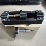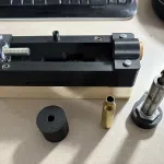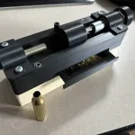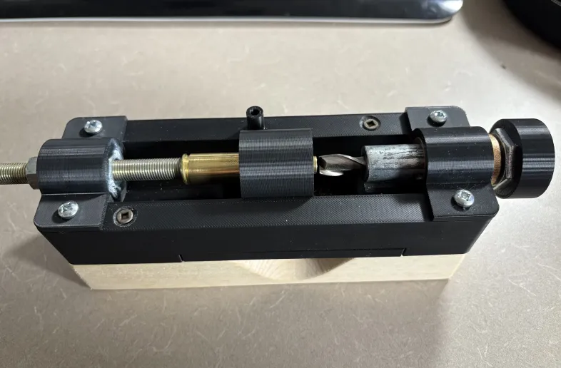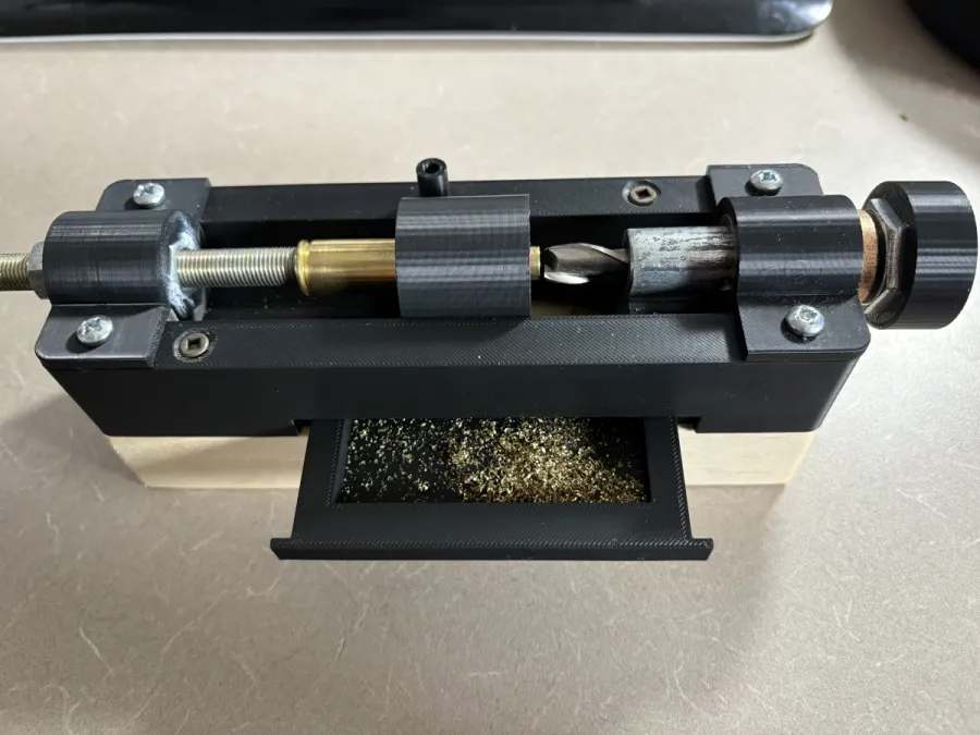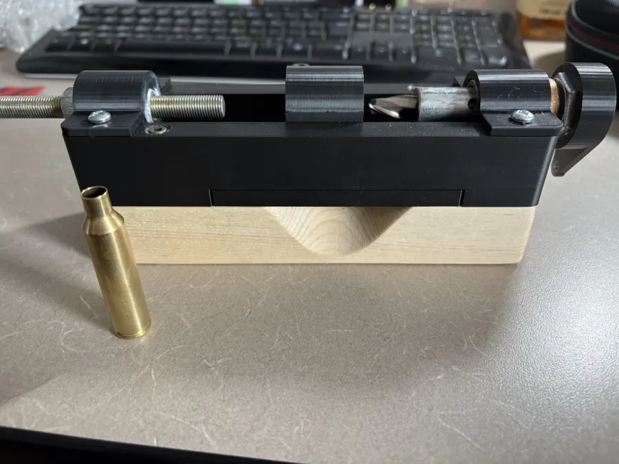 My version of a case trimmer. Similar to the LE Wilson trimmer, using a very precise, no pilot, no shell holder design. The trimmer listed in the photos uses a 3/8 2 flute endmill, this works well enough for me but could be improved with a 4 flute or even a an Rcbs cutter. My model has brass tray that catches the brass. Each calibre will need its own holder to use with the trimmer. Can ship.