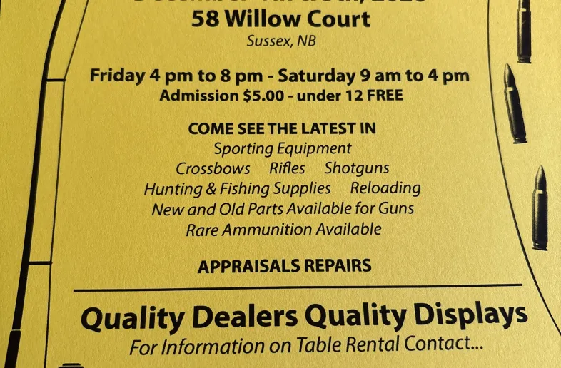 Sussex Gun Show December 4th & 5th , located at the Lions Club, 58 Willow Street, Sussex , New Brunswick