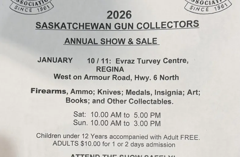 The 2026 Regina Saskatchewan Gun Collectors Show ewill be held on Jan 10-11th in Regina Sk. This show is at the Evraz Turvey Centre.