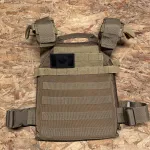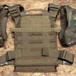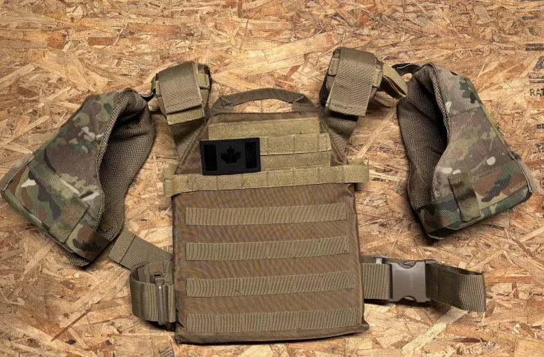 Plate carrier- Believe to be Condor brand. Cheaper carrier but still works well for what it is, comfortable fit. Shoulder pads attach to it with the velcro tabs. Comes with 2 1/2"x3" IR Canadian flag. Velcro and Molle attachments both front and back.