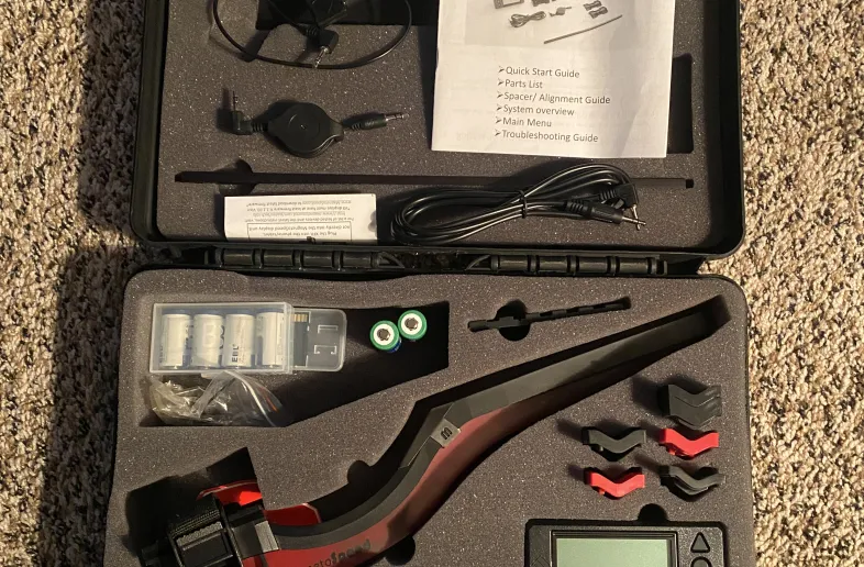Display unit, Retractable cable, Standard cable, Stainless steel blast shield, Thick and thin rubber spacers, MicroSD card with adapter, Bayonet sensor with polymer spacer kit, Hard case with polymer spacer kit, Alignment rod, Tapered spacer kit, XFR adapter cable for iPhone (flat lightning, not usb).