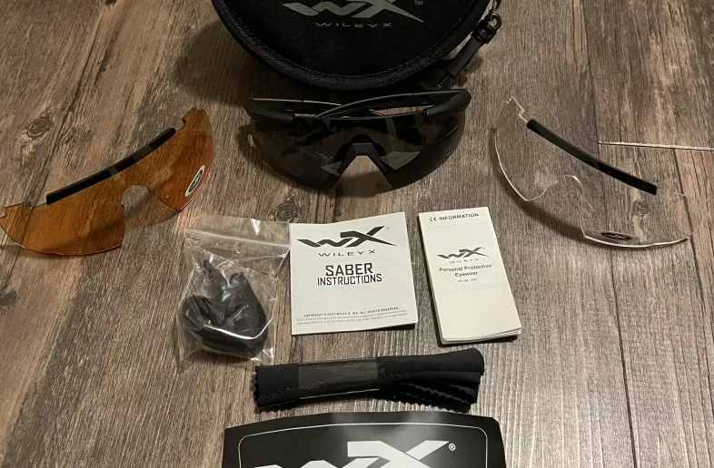 1 pair of Wiley Saber Eye Protection, with paperwork and official Wiley sticker. Comes with extra lenses (1 clear, 1 orange) which really makes this a great deal.