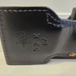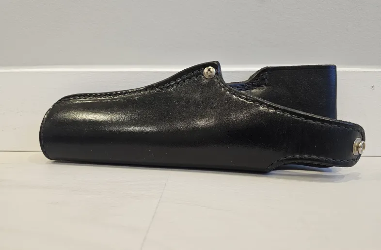 Design: A traditional high-ride duty style with a jacket slot to keep the revolver clear of clothing. Retention: Features a reinforced thumb break (snap). Construction: Premium top-grain leather, plain black, high-gloss (Clarino) finish. Compatibility: Fits Smith & Wesson K-Frame revolvers (e.g., Model 10, 15, 16, 66) with 6-inch barrels. Belt Fit: Standard loop accommodate duty belts up to 2.25 inches wide.