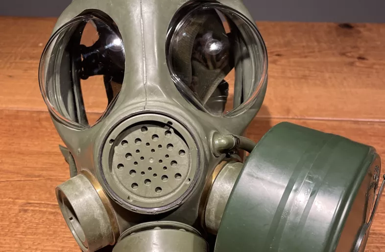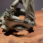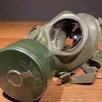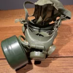 The profile of a more common green C4 gas mask. Note the drinking tube and the head strap.