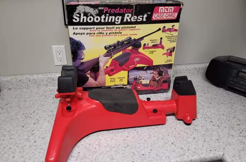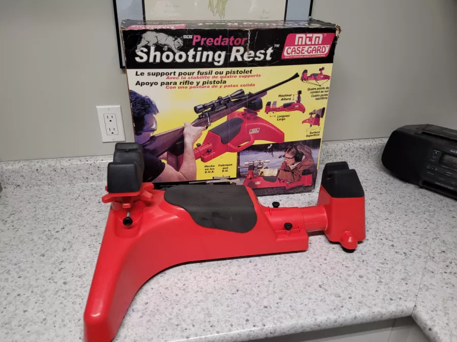MTM Predator Gun Rest for bench shooting, target practice, sighting in rifles, pistol and revolver rest too. In new condition with original box. Very stable. Fully adjustable to fit any size rifle. Rear rest adjusts for uneven surfaces. Beautiful Weatherby not included but for sale on another ad.