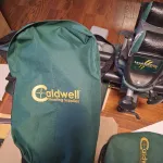 Used Caldwell Leadsled DFT. Front rest bag has duct tape on it due to front swivel stud of rifle making small tear., Back rest has a couple of small holes from rear stock swivel studs hence the extra piece of foam. Base plates have aluminum tape on them to make it easier to slide lead shot bags on and off. Max weight for shot bags is 75lbs. I used this weight for sighting a 450 Rigby. Worked well. Usually only needed 1-2 bags for other cal's. There is a falsehood going around that these rests break stocks. They do not unless used incorrectly. They will if you do not allow the rest to move with recoil. Moving with recoil is what they are designed to do, but with a reduced feel. I have fired 1000's of rounds from this rest with no issues when used properly. All components work as they should. For the amount of use or abuse this has taken it is in good shape.
