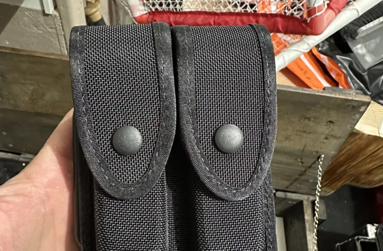 this is exactly what I’m selling. It’s brand new never used. Police style double mag pouch belt mounted with top snaps. Brand new, never used