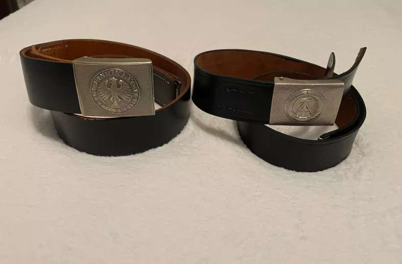 On the right: East German Army parade belt, Length adjustable ~93cm-103cm x W 4.5cm