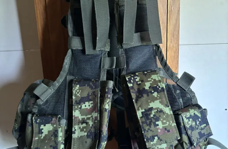New,only tried it on only to realize the pouches are fixed so no way to configure it to suit my needs. Has pistol and Ar mag pouches and many many more. Lots of adjustment in it for fitment.