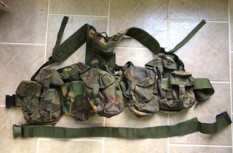 surplus, excellent condition, comes with two sizes of rigging belt. 4 mag pouches that hold 3 mags each for a total of 12, 2 canteen pouches and one "bread bag".